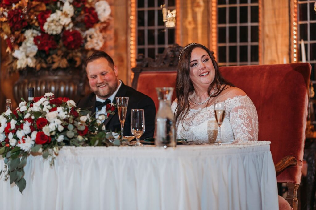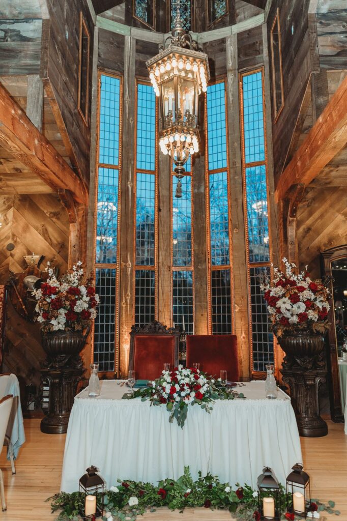 That lofted area also serves as a balcony overlooking the dance floor. There’s also an actual balcony overlooking things as well. I can sneak up there to capture sweeping shots of the celebration below. Add in the antique furniture, stained-glass windows, and gorgeous season decor and you’ve got a venue full of character. Every corner tells a story, and every photo feels timeless.